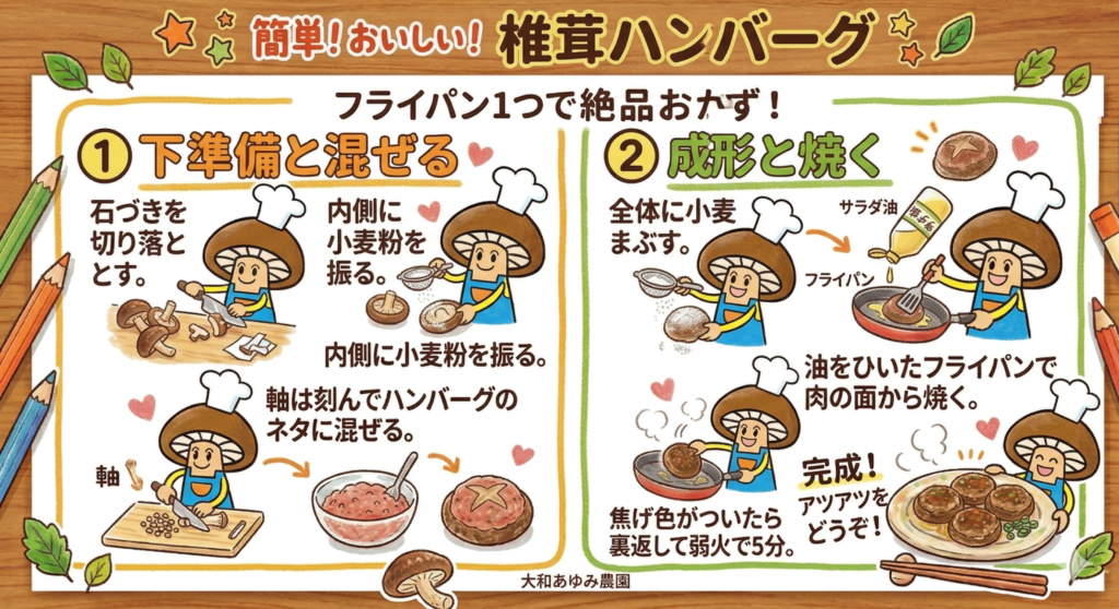 - 椎茸の石づきを取り、汚れを拭く。内側に小麦粉をふる。軸は刻んでハンバーグのタネに混ぜる。