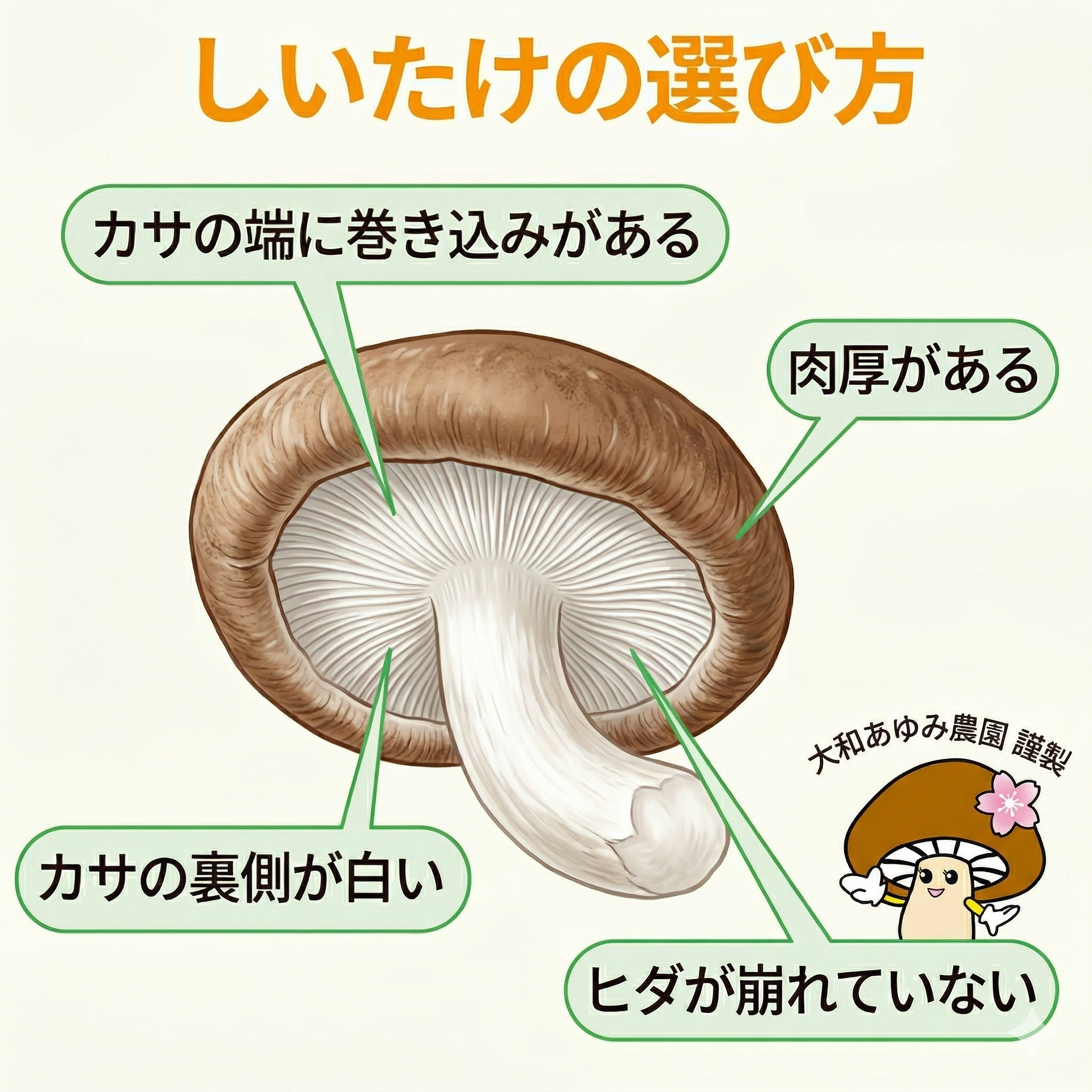 かさの裏が白くひだが整っているもの、かさの縁が内側に巻き込んだ肉厚なものが、鮮度抜群で美味しい証です。