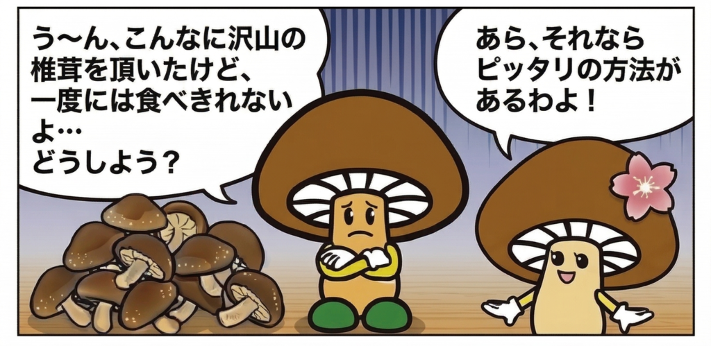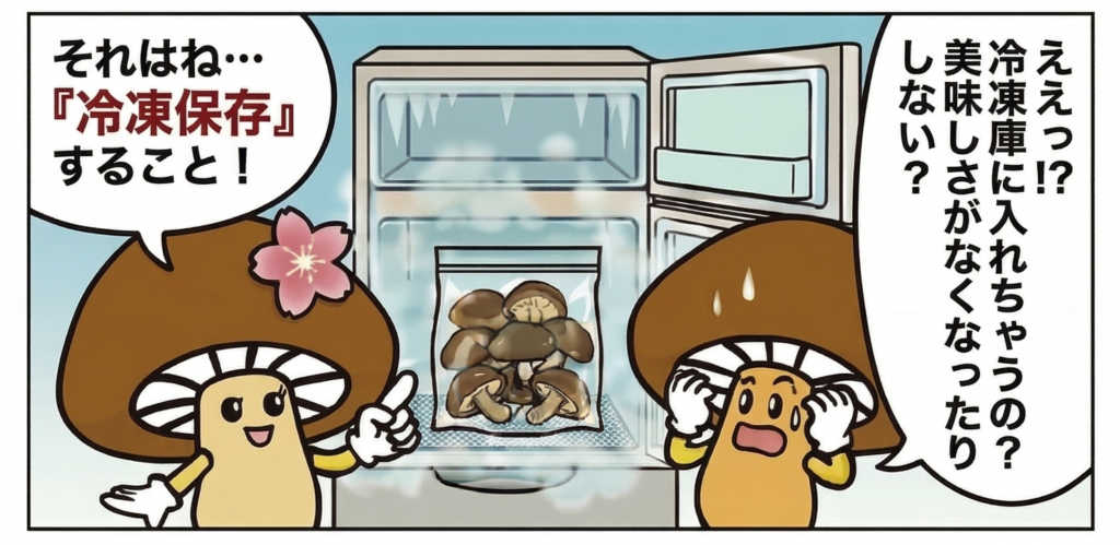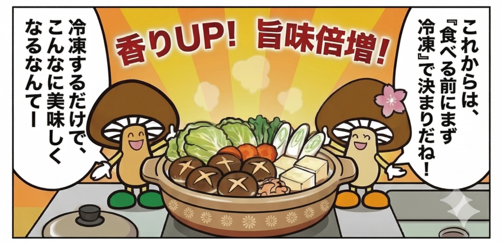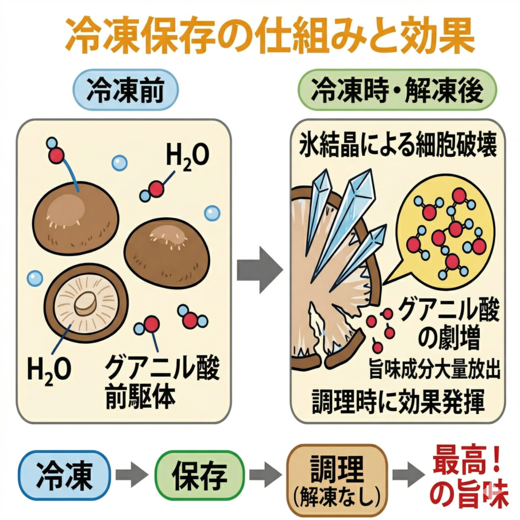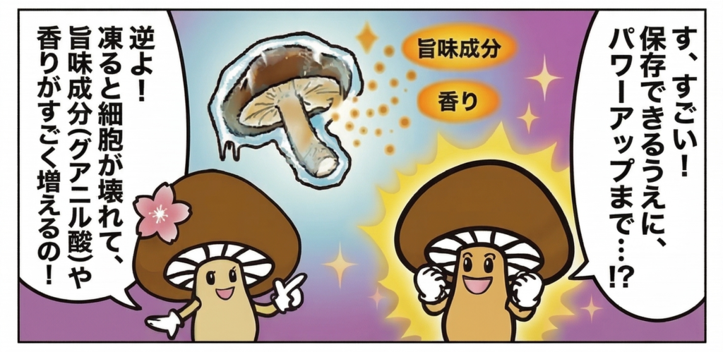 冷凍すると細胞が壊れ、調理時に旨味成分(グアニル酸)が激増します。適当な大きさに切って冷凍し、そのまま調理してください!