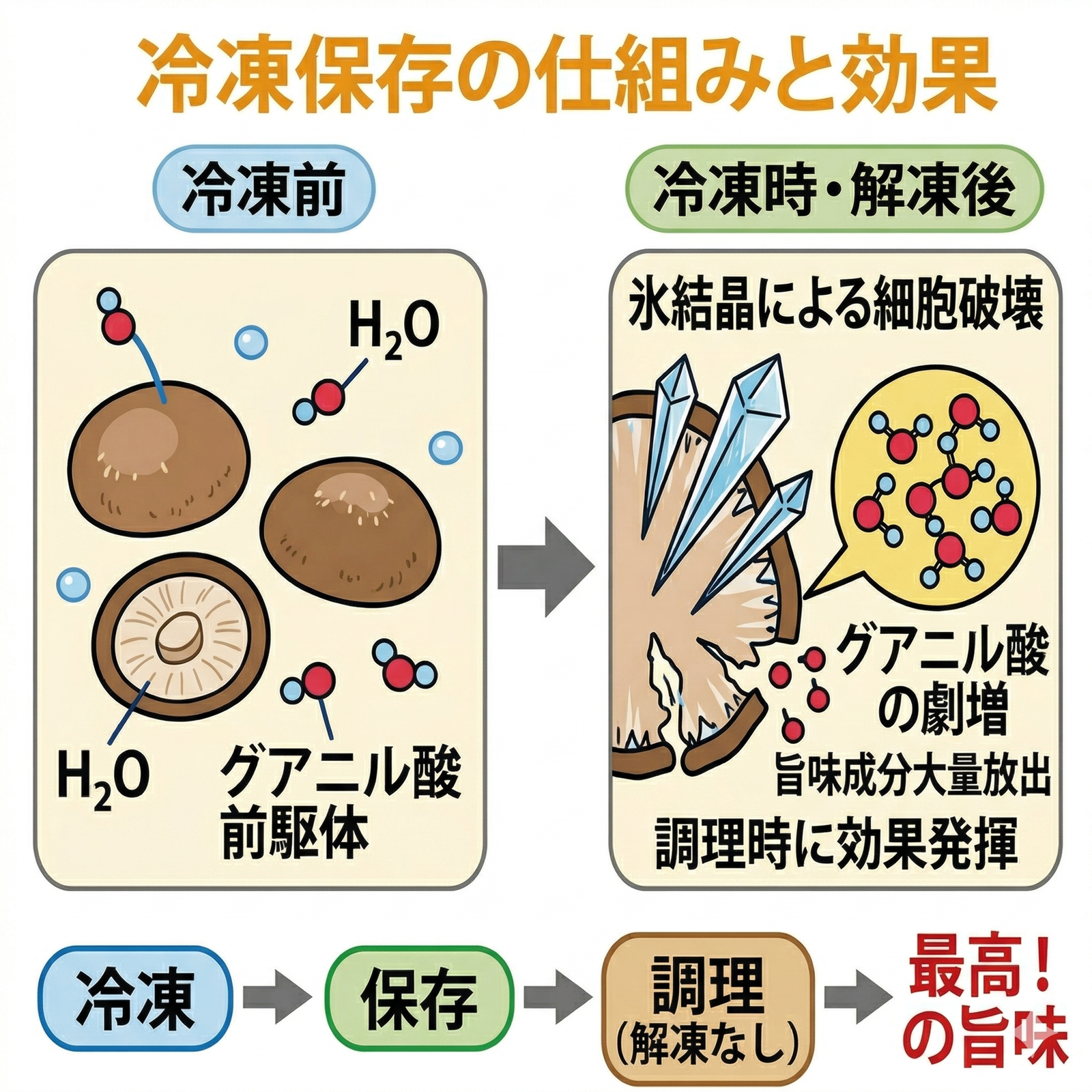 冷凍すると細胞が壊れ、調理時に旨味成分(グアニル酸)が激増します。お好みの大きさに切って冷凍し、そのまま調理にお使いください!